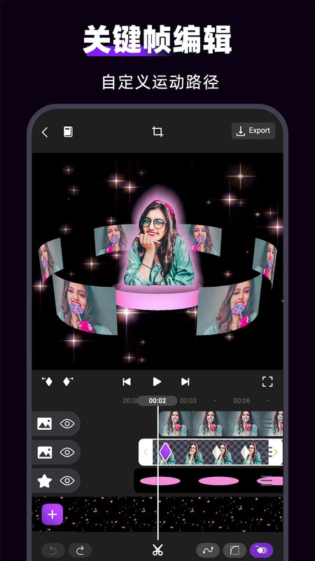 1. 全面支持对所有素材及工具进行关键帧编辑,同时提供关键帧动画功能,涵盖素材大小等基础参数设置。