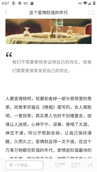 一款App,是有着浓郁韩寒风格的阅读软件,以简约清新闻名。它在满足阅读基本需求的基础上,融入诸多新颖且独具特色的元素。在竭力为用户带来丰富优质阅读体验的同时,用户还能分享阅读的喜悦,与作者以及志同道合的读者们在同一平台交流留言。如此一来,阅读不再仅仅是纯粹的个人行为。而且,其别具一格的阅读模式,为用户打造了良好的阅读环境。无论何时何地,你都能在这款软件上安静阅读,探索新领域。快来这里书写你的故事与心情,生成专属你的小故事吧!