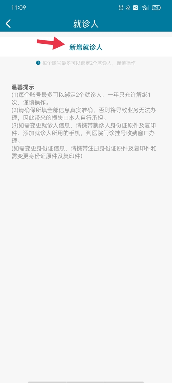 4、点击新增就诊人,而且要注意的是一个账号只能绑定两个就诊人,一年只允许解绑一次。