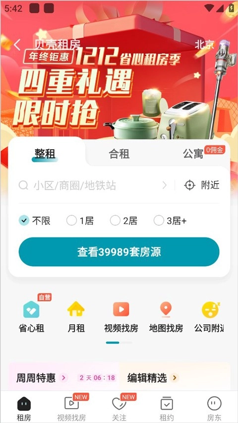 在租房界面的首页,为了精准用户的租房需求,提供了整租、合租以及公寓选项,其他还包括更多细节条件筛选。
