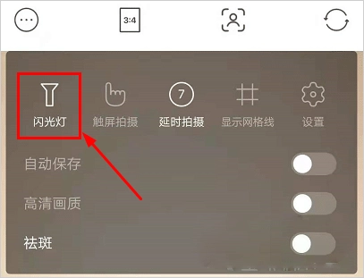 1、在相机左上角的设置功能可以看到”闪光灯“的功能选项,点击开启。