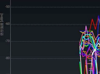 在使用Wifi分析助手分析Wifi信号强度时可以选择不同的视图模式。比如这张图,每个线路都由不同颜色的折线代表,屏幕上方还有不同无线网络所代表的颜色,用折线图形式的模式我们可以更清楚的看到不同线路的无线网的信号强度。