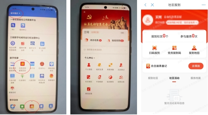 打开渝快政→点击工作台→左上角处选择:“数字重庆”→点击“红岩先锋智慧党务”→将“管理中心”旁下三角处切换到“个人中心”→点击“社区报到”→党员可根据具体情况,选择页面中的“扫码报到”“党员报到码”或“报到地图”进行报到。