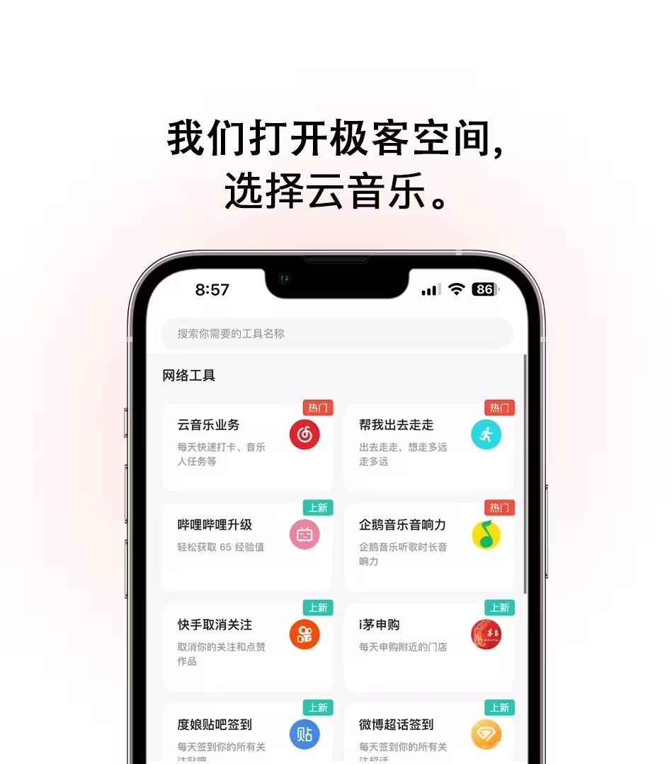 极客空间是基于极简风格、原创设计等理念打造的小众化聚合软件分享平台。它致力于分享大量网络工具、各类优惠券以及网络资源。在众多功能中,“云音乐业务”格外引人注目。通过极客空间的“云音乐业务”,能够自动每日打卡网易云音乐听歌数(上限为300),用户依靠这一功能可迅速将网易云音乐账号等级提升至满级。