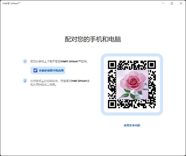 2、通过手机上的Intel Unison应用扫描二维码(或者改用文本代码)进行连接。