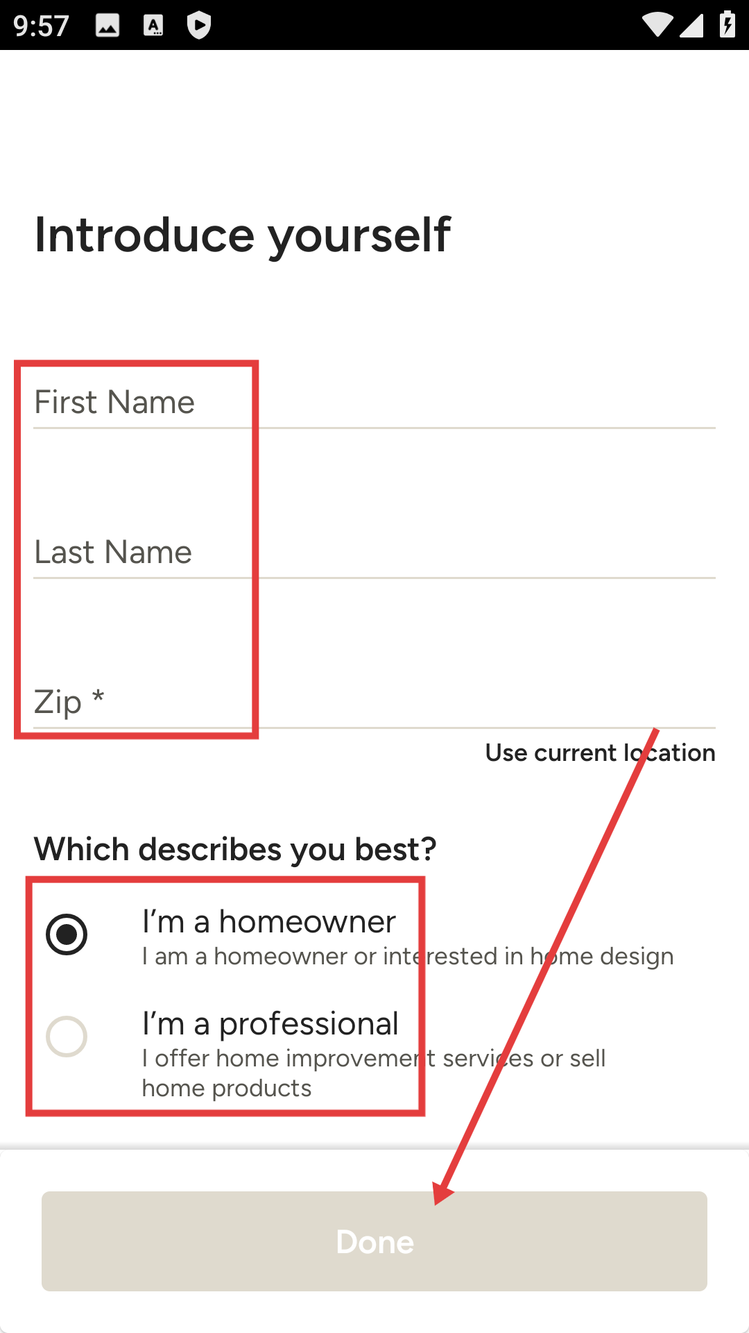 4、在自我介绍界面依次填写【FirstName】【LastName】【Zip】,选定身份类型后,点击【Done】按钮,即可完成整个注册流程。