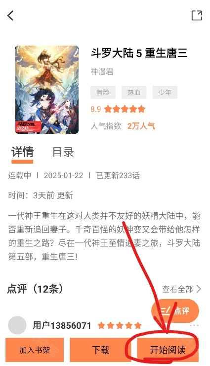 5、进入详情界面后点击右下角的开始阅读,即可开始观看