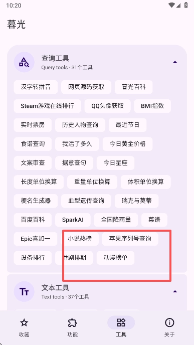 暮光工具箱是一款相当实用的工具类应用,用户可以通过它获取丰富多样的工具资源,随时都能在平台上挑选自己需要的工具来体验,为大家带来便捷高效的使用感受,若您想探索更多工具内容,现在就来使用吧!