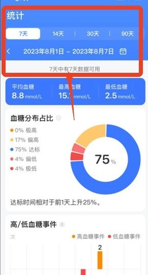 1、历史数据统计,每一日的血糖检测数据会自动记录,可以看到自己的血糖健康情况。