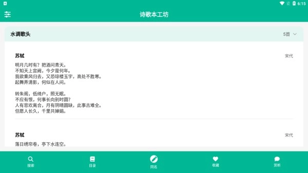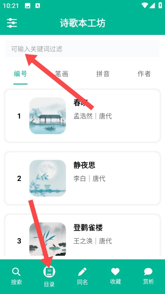 2、切换至目录页,利用顶部过滤框,输入关键词筛选诗歌内容。