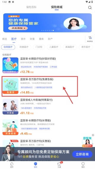 3、在医疗类保险产品列表中,选择蓝医保·百万医疗险免健告版产品,点击进入详情页。