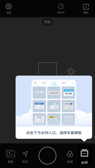 2、进入相机首页,第一次打开会提示水印模板所在。