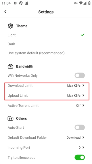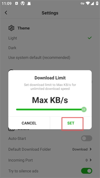 5、调试完成后点击【SET】按钮进行设定。如此一来,当你在安卓设备上进行种子流操作时,新的速度就会被设置为uTorrent的速度上限。