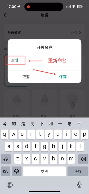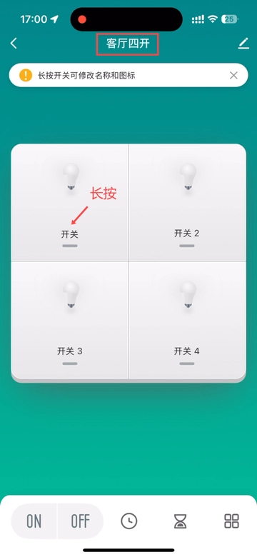 比如这个“客厅四开”对应下方的红色普通开关面板,长按‘开关一’,点击开关名称,对应面板刻字‘廊灯’进行重命名,保存即可。