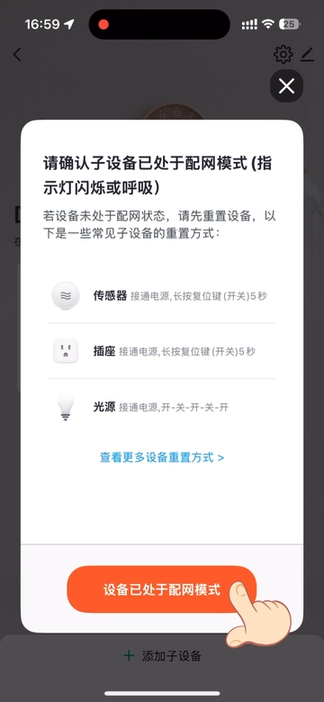 此时点击确认配网,网关会自动搜索附近的Zigbee子设备并添加入网。