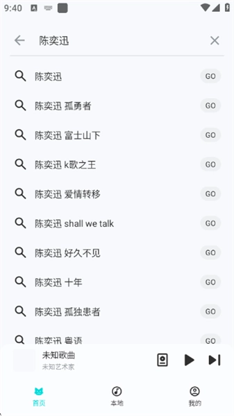 打开软件后,点击顶部 “搜索框”,输入歌曲名、歌手名或关键词(如 “陈奕迅”);