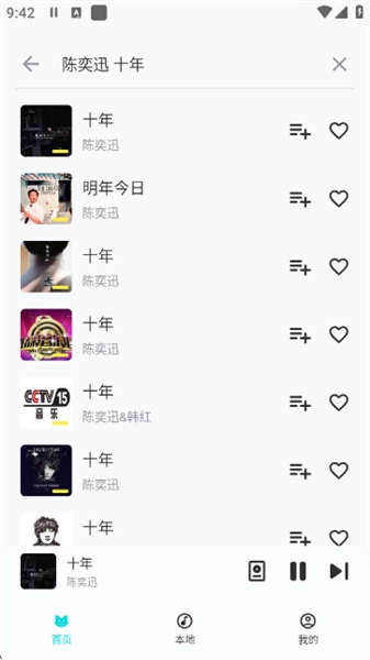 在搜索结果中点击目标歌曲(如《十年》),即可启动播放;