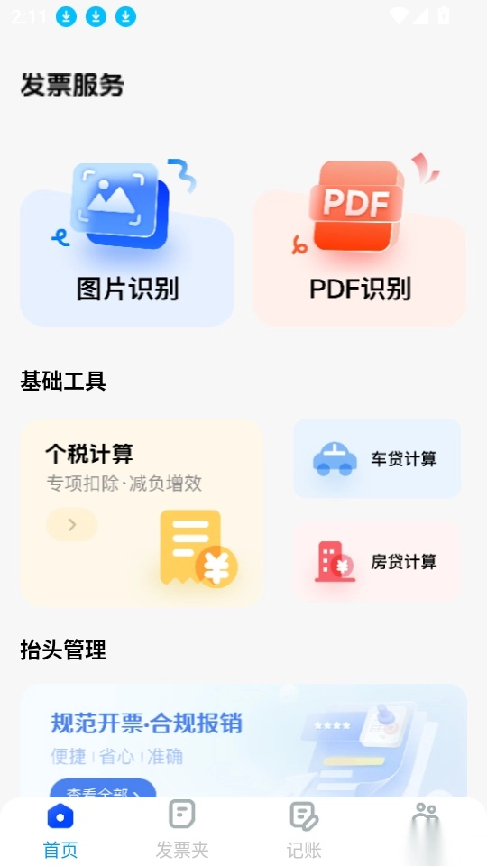 电子发票税务管家是一款专注于电子发票与税务管理的辅助软件,为用户配备了实用的管理工具,助力用户轻松高效地管理发票。软件支持对图片、PDF格式的发票文件一键识别,能快速提取发票信息并完成导入,还可实现发票抬头的便捷管理,用户可对个人发票夹进行分类整理与导出操作。平台支持实时发起发票报销申请,方便用户随心记录消费情况,轻松完成报销记账与消费备忘。此外,软件贴心的财税小助手功能,可精准计算个税、房贷等税务相关数据,有需求的用户欢迎前往本站体验使用!