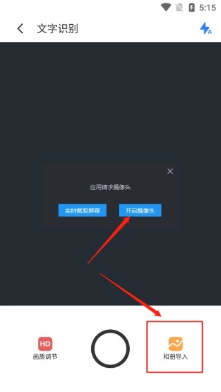 3、以图片为例,点击图片在线提取文案,进去相机页面,可选择现场拍照、实时屏幕截取以及相册导入三种方式