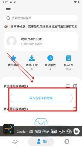 1)进入首页切换至“我的”页面,点击“导入音乐平台歌单”按钮,选择KG。
