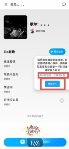 3)滑动到歌单底部,当右侧对话框中的歌曲总数量与已获取数量相同,则点击确认导入按钮,并耐心等待。