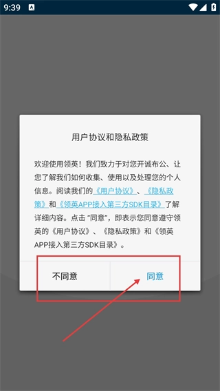 在【用户协议和隐私政策】页面,仔细阅读【《用户协议》】与【《隐私政策》】的内容后,点击【同意】按钮,即可继续使用【领英】服务。