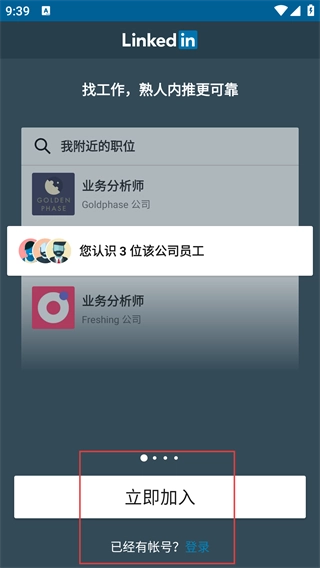2、进入【LinkedIn】界面,若需注册新账号选【立即加入】,已有账号则点击【登录】,可借助熟人内推找工作。