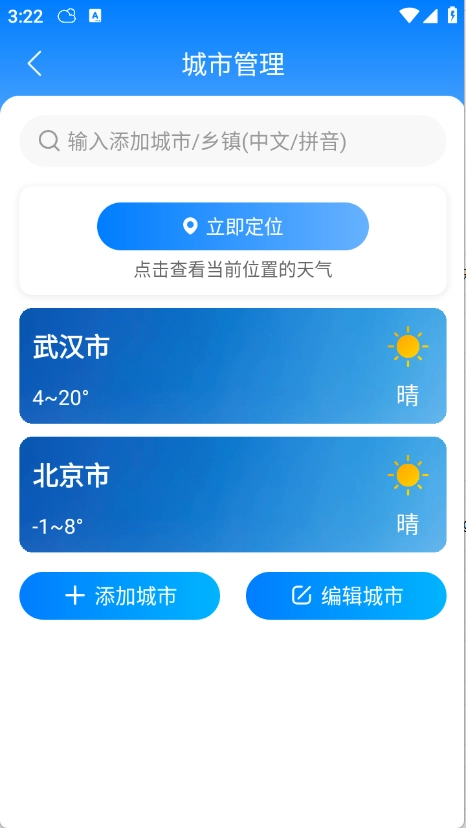 1、城市管理:支持自动定位当前所在位置,也可手动添加所需城市,让天气查询更快捷,城市管理更便捷。