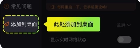 在云手机菜单中点击"添加到桌面”可将当前云手机作为快捷方式添加至手机桌面,您可以直接从桌面进入云手机(部分机型需要先为盒子开启创建快捷方式权限)。