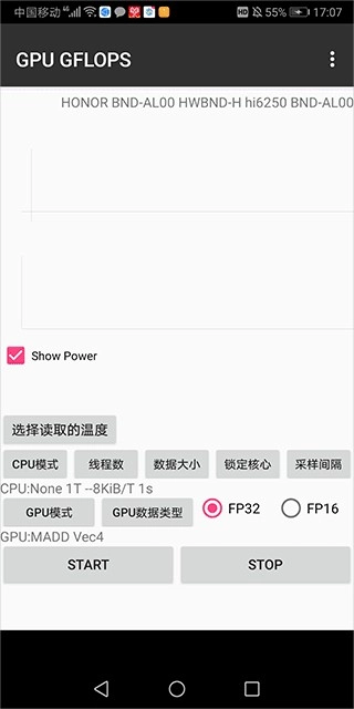 打开软件后,界面会显示手机GPU当前的实际功率消耗数值,接下来你需要从中选择一个GPU功率值来开展测试。
