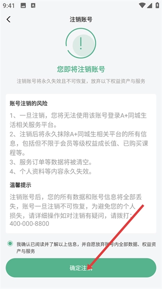 4、在【注销账户】页面,阅读并确认账号注销的风险与提示后,勾选确认项,点击【确定注销】完成账户注销操作。
