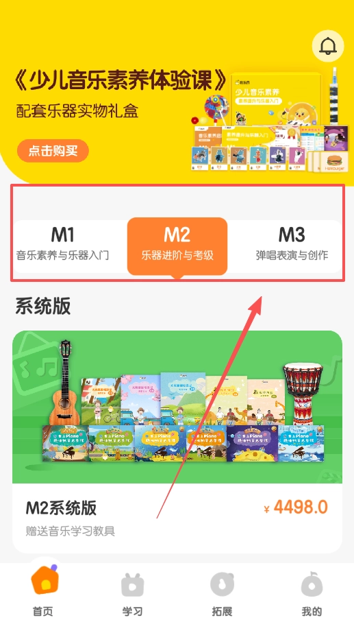 2、回到首页,你可以浏览并购买少儿音乐素养体验课及其配套乐器礼盒,还能查看系统版的课程体系呢。