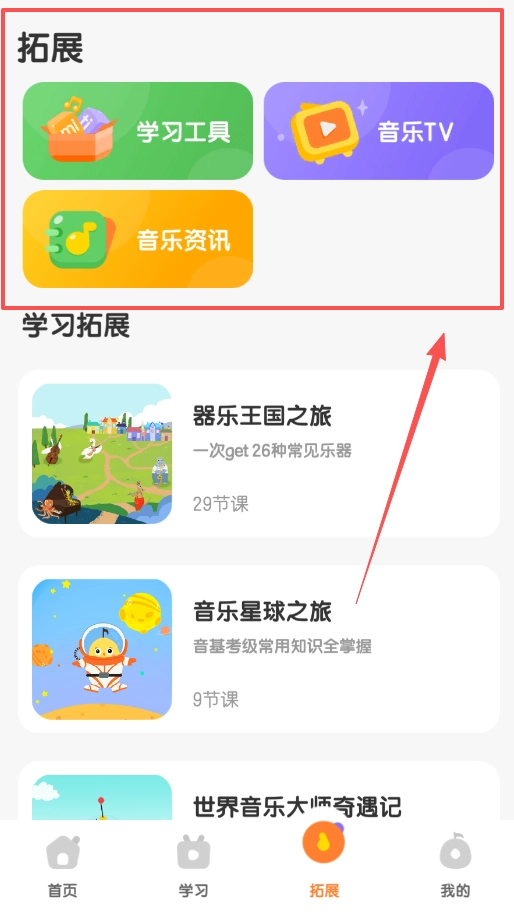 3、切换到拓展页,里面有器乐王国、音乐星球等丰富的专题课程,能帮你认识乐器和学习乐理知识。