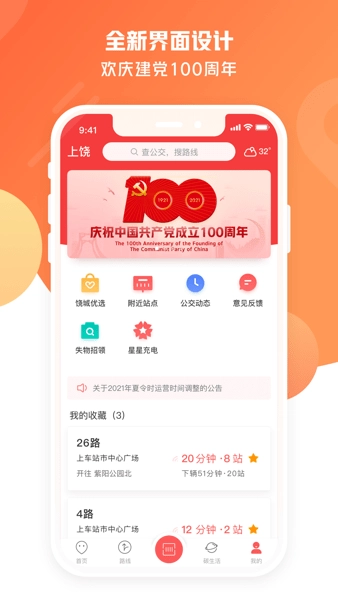 为庆祝建党100周年,饶城通手机版换上了全新的红色主题设计。同时,饶城优选、附近站点、公交动态、失物招领等实用功能,能让您的出行与生活更加便捷!