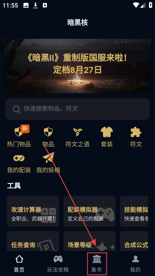 1、在暗黑核首页,点击【集市】选项,就能进入集市页面,查看各类物品的交易信息了。