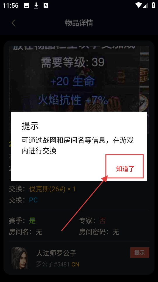 4、查看提示信息后,点击【知道了】,可关闭提示弹窗,继续进行物品交易操作哦。