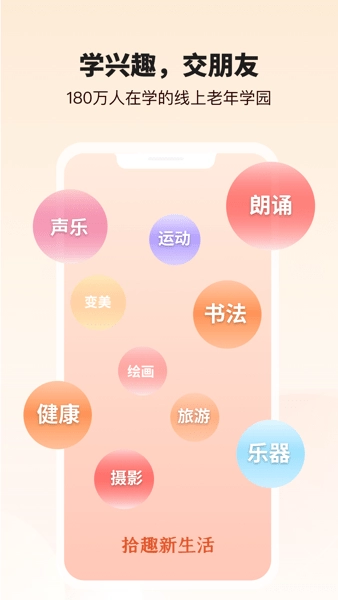 “拾趣新生活”是一款面向广大中老年人的线上兴趣学园,致力于助力他们开启精彩的退休生活。在这里,中老年人可以学习各类兴趣爱好,结识志同道合的伙伴,尽情享受学习带来的乐趣。