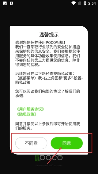 1、仔细阅读【POCO相机】的【用户服务协议】与【隐私政策】,点击【同意】按钮,就能进入应用的主功能界面。