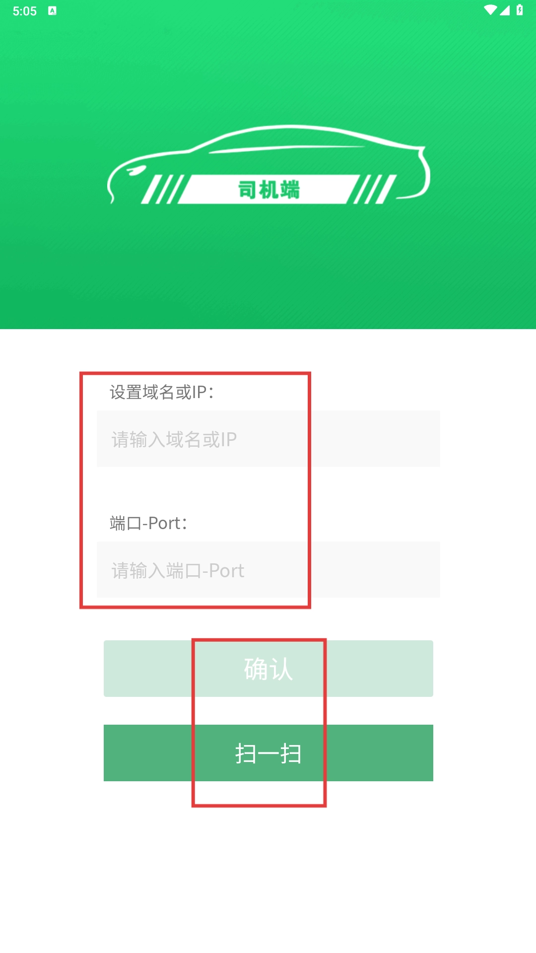 3、进入【司机端】界面,填写【域名或IP】和【端口-Port】内容,通过【确认】或【扫一扫】完成配置。