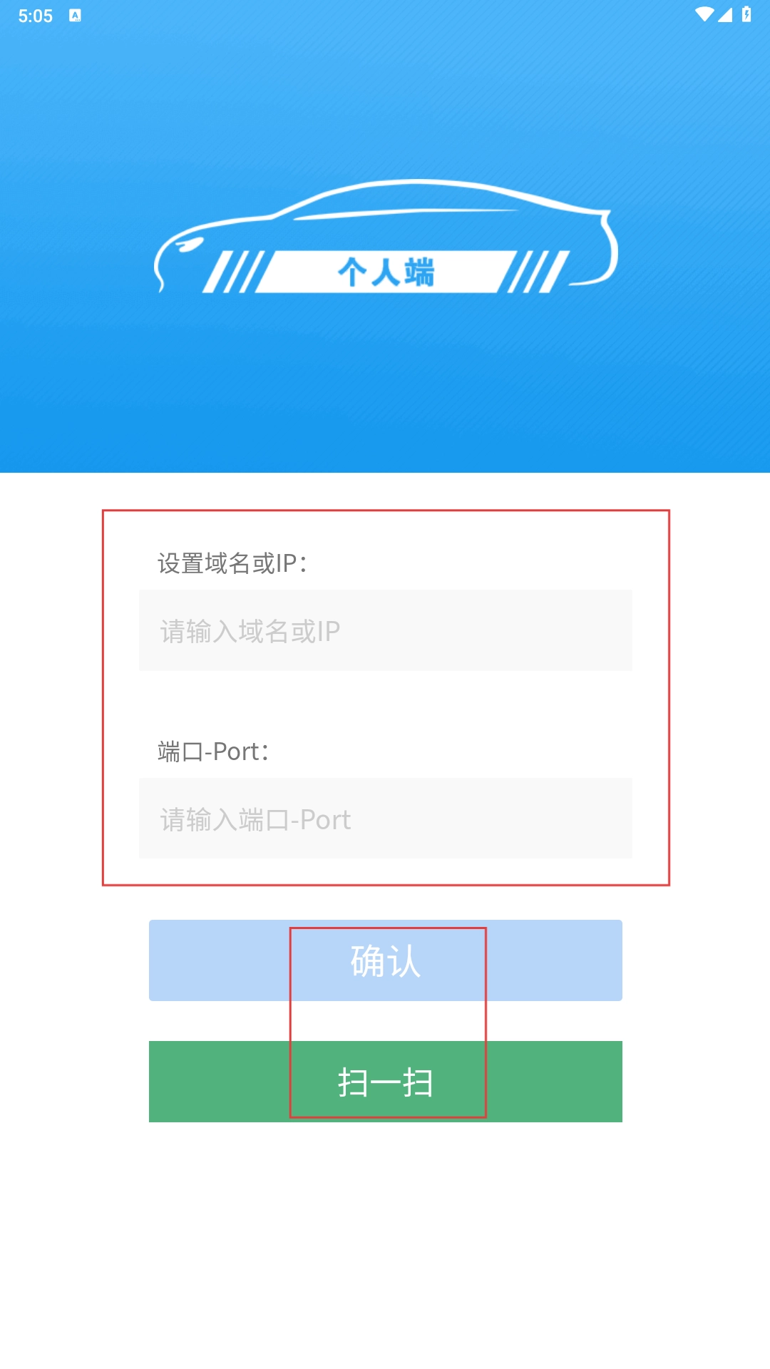 2、在【个人端】界面,输入【域名或IP】与【端口-Port】信息,可点击【确认】或【扫一扫】完成设置。