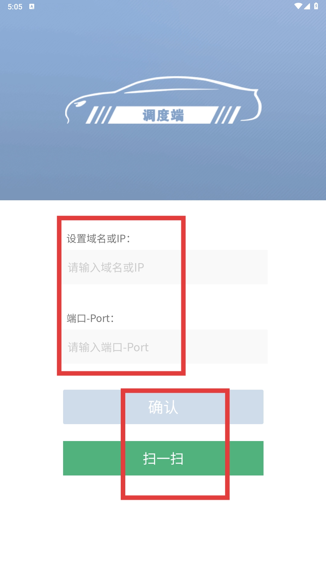 4、打开【调度端】界面,输入【域名或IP】与【端口-Port】信息,使用【确认】或【扫一扫】完成设置。