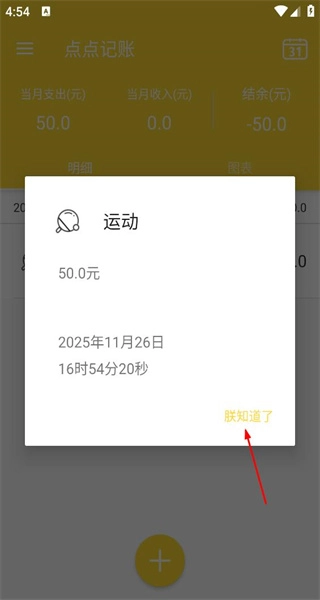 3、完成记账后返回主页面,看到当月支出变为50,结余显示负50,明细区域出现运动相关的支出记录。