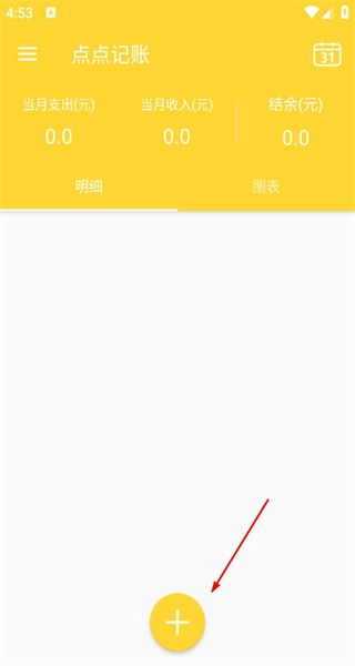 1、打开软件进入主页面后,会看到当月的支出、收入和结余均显示为0,此时点击底部的加号按钮,即可进入对应的记账操作界面。