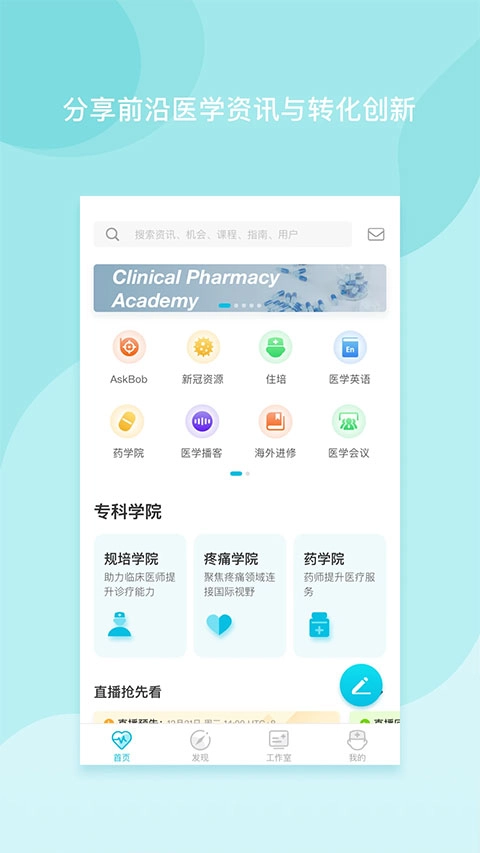 2、浏览首页内容:打开后在首页可以浏览各种直播课程和最新的医学资讯。