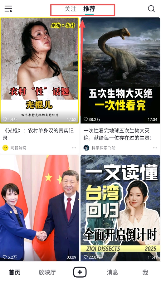2、首页分为关注和推荐两个板块,推荐页会根据算法推送个性化内容,包括农村题材、科普知识等各类视频。