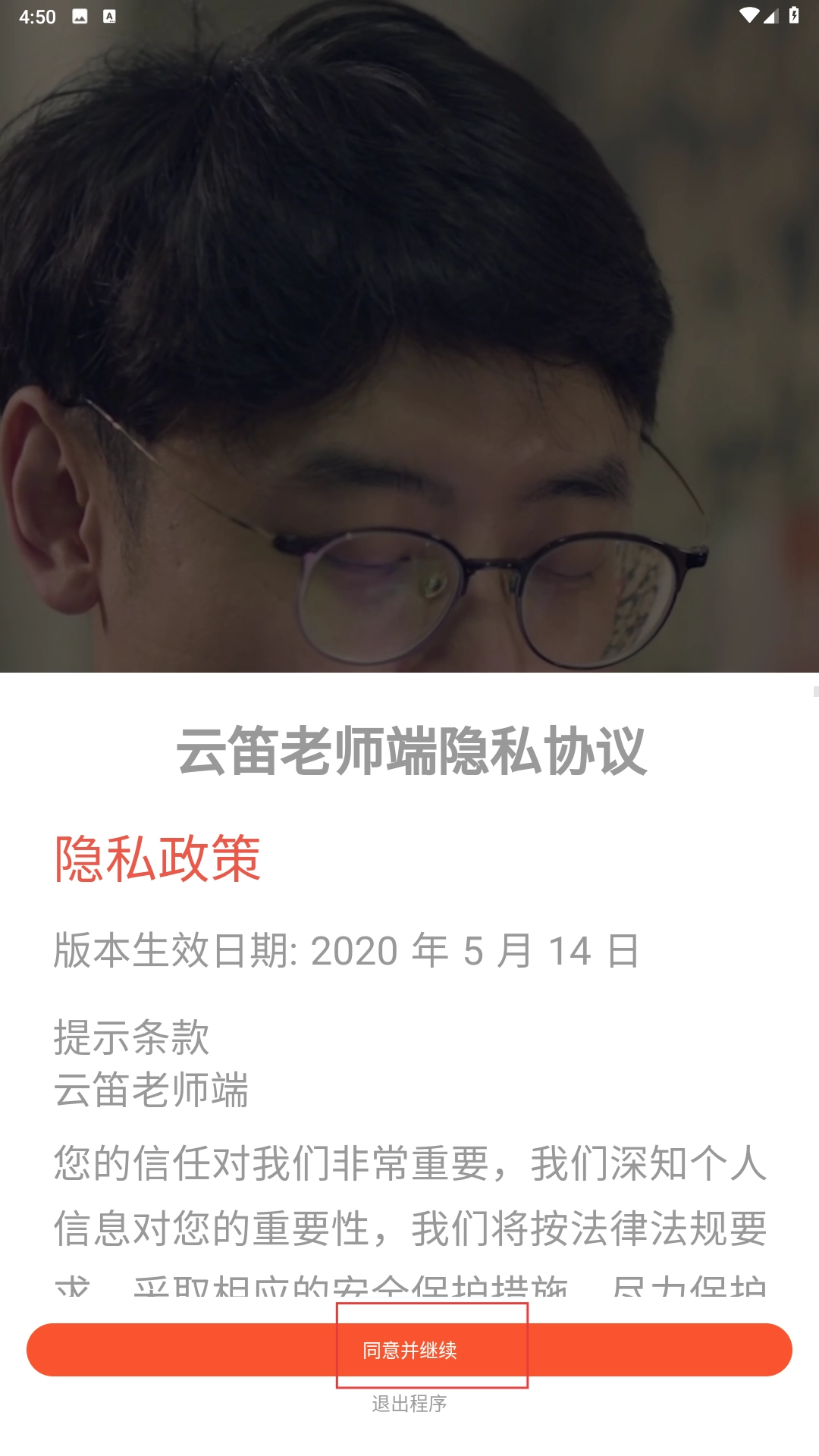 1、在隐私协议页面点击【同意并继续】按钮,即可进入下一步操作。