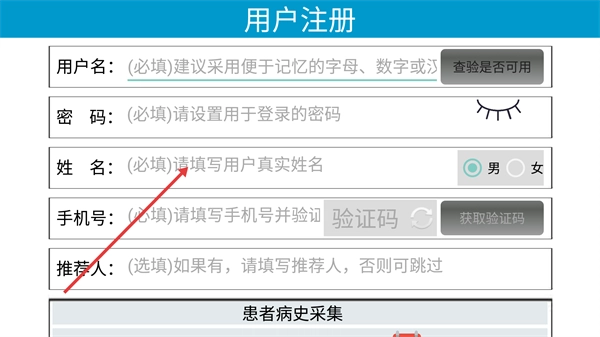 3、进入【用户注册】页面,需填写【用户名】-【密码】-【姓名】等必填项,选填【推荐人】后继续后续步骤。