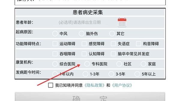 4、在【患者病史采集】模块,需选择【患者年龄】-【起病原因】等信息,勾选协议后点击确定完成信息提交。
