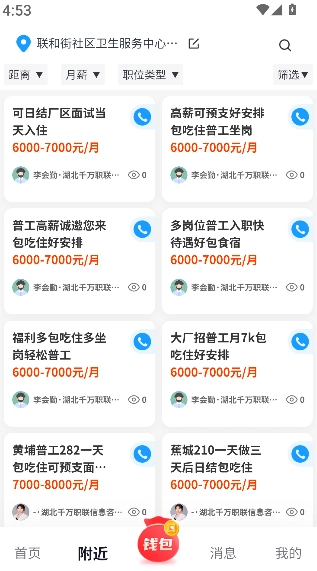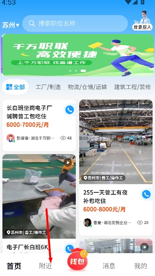 1、进入首页后,点击“附近”入口,即可查看周边的招聘信息以及职位分布情况。