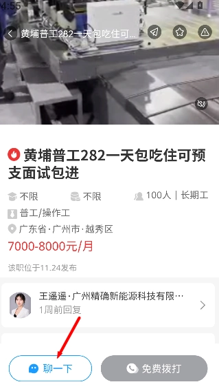 3、点击感兴趣的职位进入详情页面,了解岗位内容并可点击“聊一下”进行沟通。